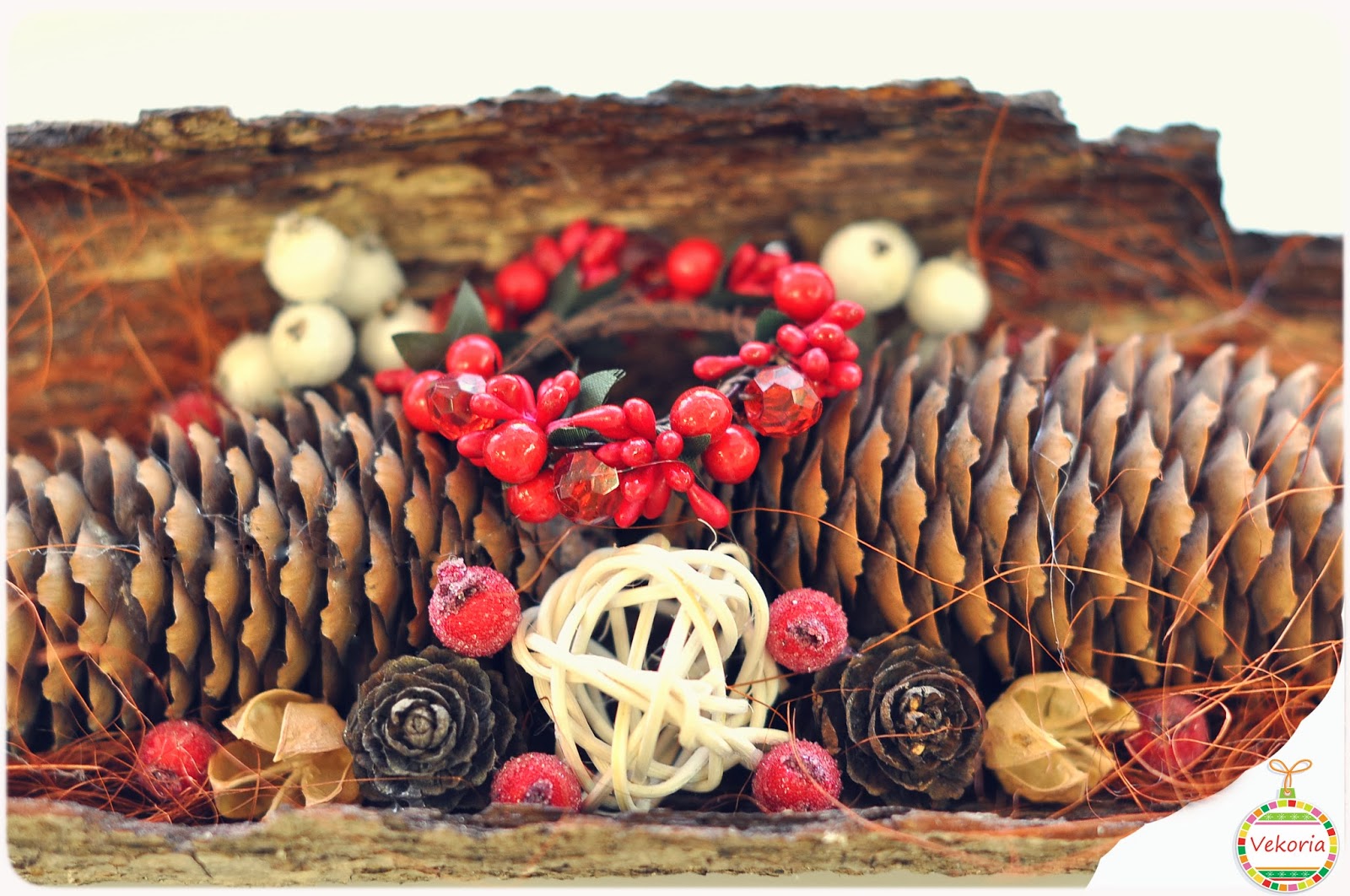 Кору я вскрыла акриловым лаком с внутренней стороны.В начале я,просто,разбросала основные крупные материалы в кору,а затем началась поклейка и добавление деталей.